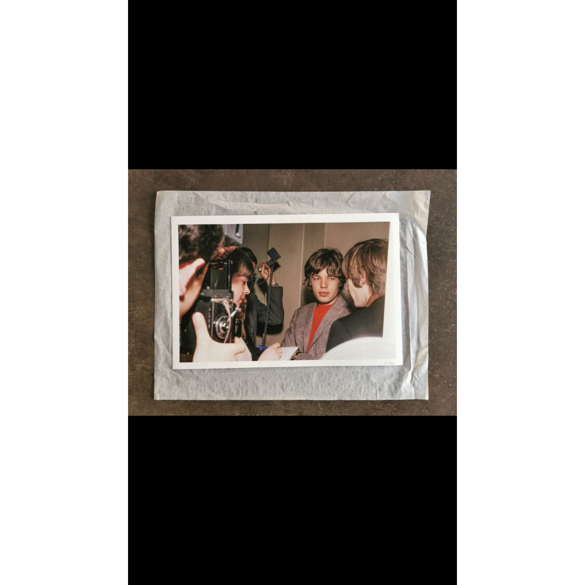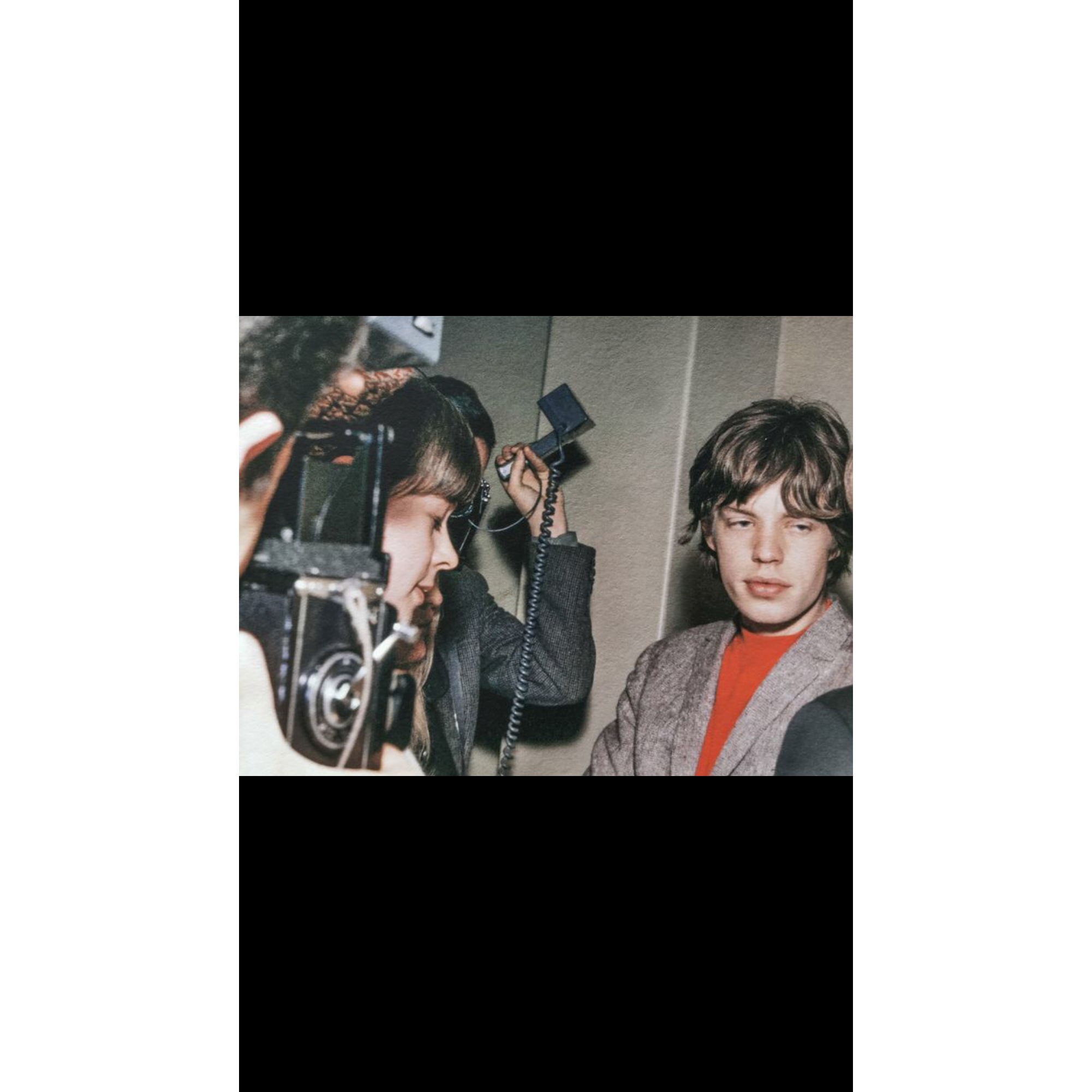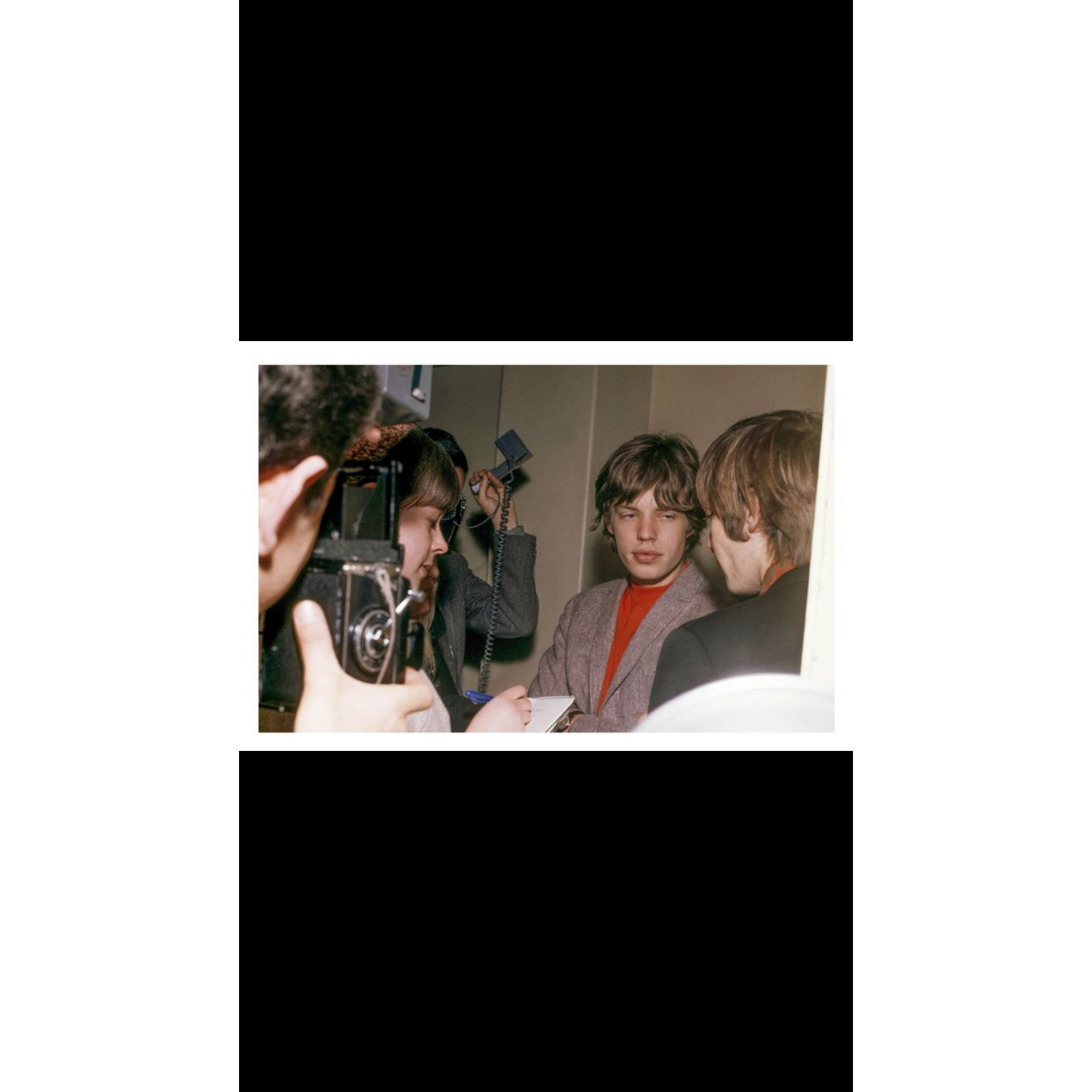 It depicts Mick Jagger in his early days in front of the microphones and cameras of the many journalists gathered for an interview.